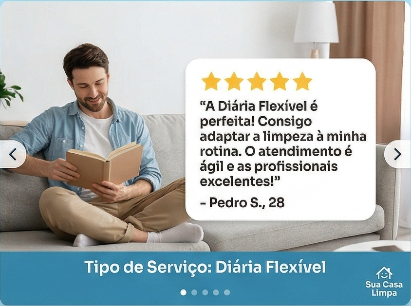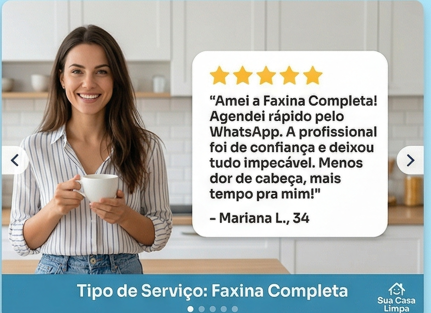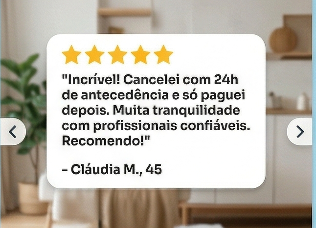 Com profissionais confiáveis, avaliados e prontos para atender quando você quiser, você agenda sua faxina em poucos minutos — sem burocracia, sem dor de cabeça.